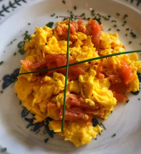 Three farm-fresh eggs whisked with fresh cream and cooked to perfection with delicate smoked salmon folded in just before serving and lightly sprinkled with fresh chives. Served with your choice of toast.